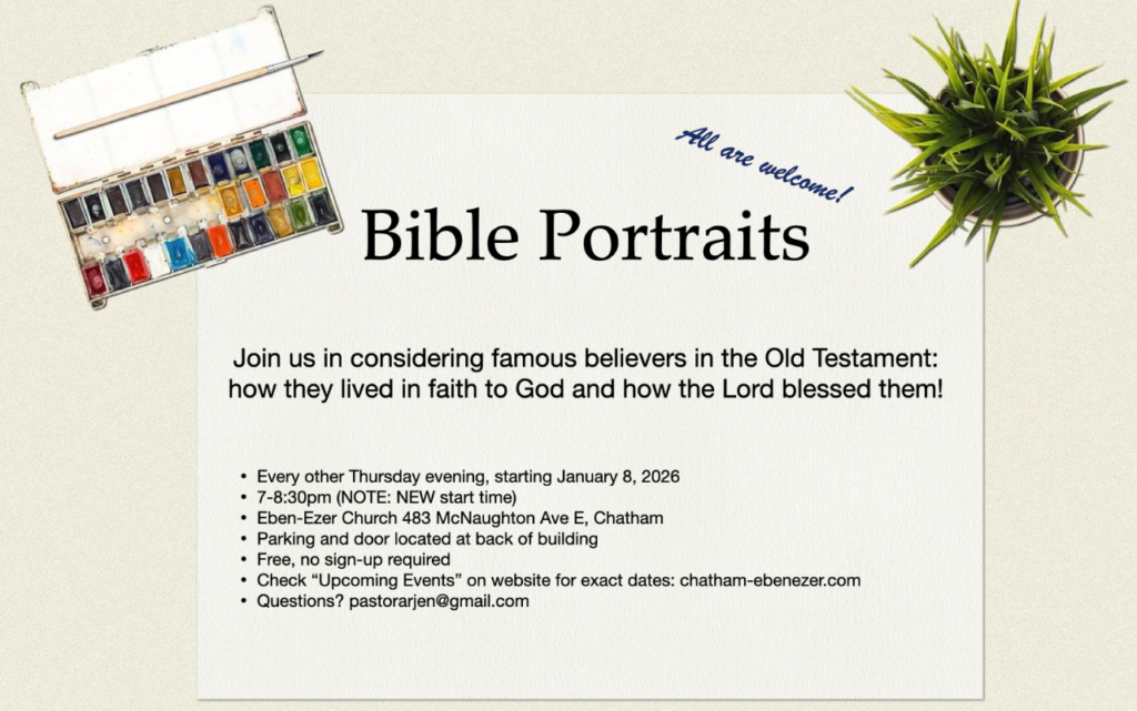 Join us for a new Bible Portraits class starting on Thursday, January 8, 2026 at our church building from 7.00-8.30pm. It will be every other Thursday, and will include a study of Adam & Eve, Noah, Abraham & Sarah, and more! All are welcome, and you do not need to sign-up, just show up!